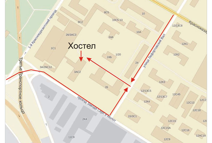 Въезд на территорию со стороны улицы Лефортовский Вал до двухэтажного здания светло-зеленого цвета.